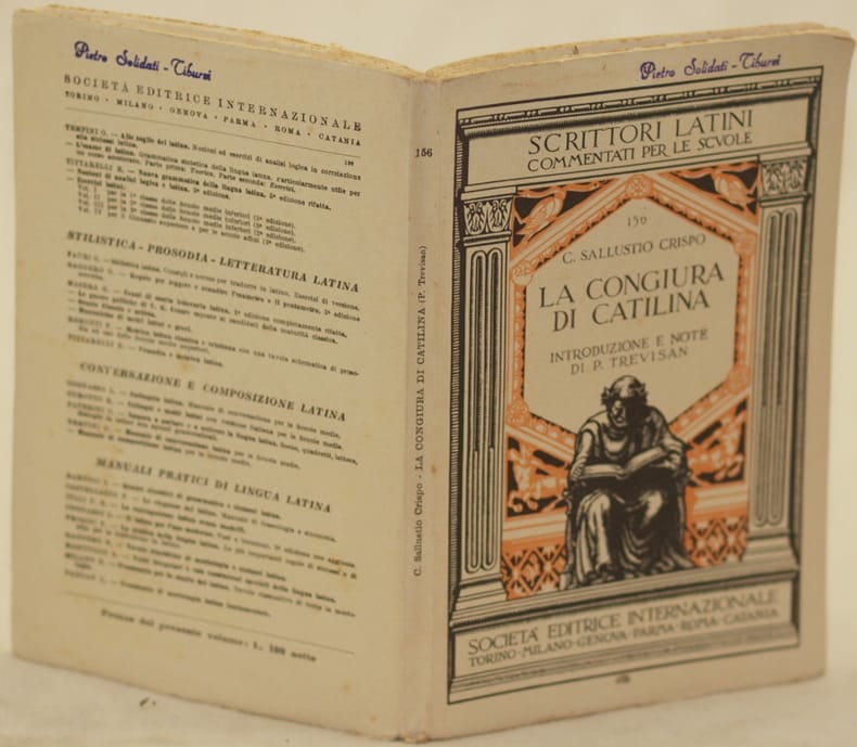 In 8. Dim. 21x13,5 cm. Pp. XI+(1)+140+(2). Edizione del 1946 di questa opera classica di Caio Sallustio Crispo La congiura di Catilina della collana "Scrittori latini commentati per le scuole".<BR>Introduzione e note di Pietro Trevisan. Testo latino con note in italiano. Timbro di appartenenza. In buone condizioni. Brossura editoriale in buone condizioni generali con lievi usure ai margini e dorso. (vedere foto). Legatura in buone condizioni. All'interno le pagine si presentano in buone condizioni con rare fioriture. Edition of 1946 of this classical work by Caio Sallustio Crispo La congiura di Catilina of the series "Scrittori latini commentati per le scuole". Introduction and notes by Pietro Trevisan.<BR>Latin text with notes in italian. Name of the ex owner. In good conditions. Editorial cover in good general conditions slightly worn in the edges and spine. Binding in good conditions. Inside pages are in good conditions with occasional foxings.