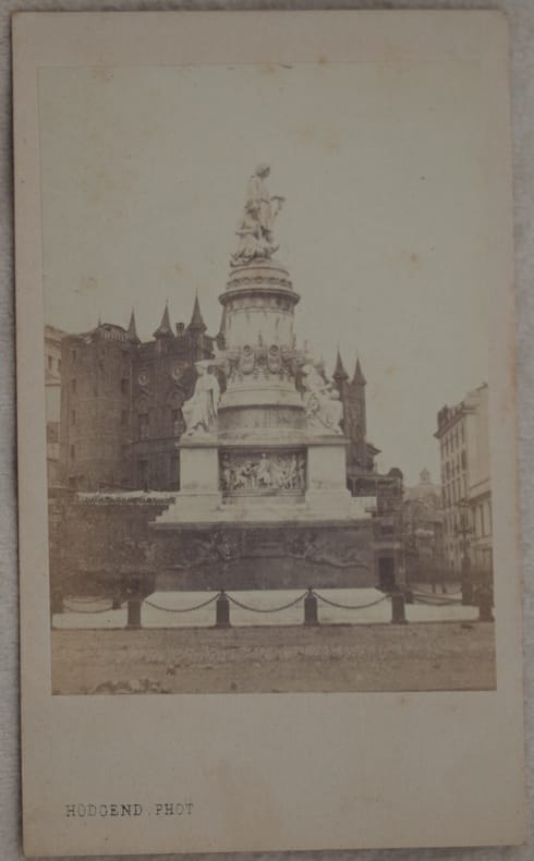 Foto originale all'albumina del 1870 circa che mostra il monumento a Cristoforo Colombo a Genova.<BR>Al verso timbro "Hodgend photographie" di Genova e nota manoscritta "Cristoforo Colombo".<BR>La fotografia è applicata su cartoncino originale marchiato. Dimensioni cartoncino: mm 105x62. Dimensioni foto: mm 77x55. In ottime condizioni. Original albumine photo of 1870 circa showing monument to Cristoforo Colombo in Genova.<BR>In the verso mark "Hodgend photographie" in Genoa and handwritten note "Cristoforo Colombo".<BR>The photo has been applied in an original marked carton paper. Size of page: mm 105x62. Size of the photo: mm 77x55. In very good conditions.