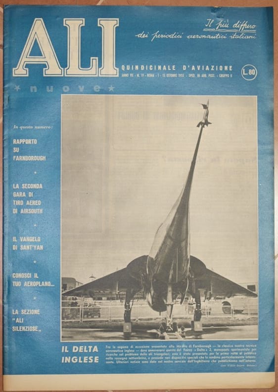 In folio. Dim. 40x30,5 cm. Pp. da 298 a 308+(8). Numero del 1-15 ottobre 1955 della rivista settimanale "Ali" di aviazione. "Ali" il periodico degli aviatori italiani nasce a Milano il 28 Marzo 1944 per essere pubblicato fino al 28 Aprile 1945 quando si interruppe a causa della guerra. Riappare nel 1951 fino al 1977 variando più volte di nome. Tra gli articoli presenti: Stazione di sanita aerea di Ciampino, Seconda gara di tiro aereo Airsouth, Rapporto su Farnborough, A Venezia avioraduno nazionale, Aliante Allodola ecc...<BR>Numerose notizie di attualità e foto d'epoca all'interno. In buone condizioni. Copertina editoriale in buone condizioni generali con lievi usure ai margini e dorso. Legatura assente. All'interno le pagine si presentano in ottime condizioni con rare fioriture. Number of the 1-15 of october 1955 of the weekly magazine "Ali" of aviation.<BR>"Ali" the magazine of italian aviators was born in Milan the 28th of March 1944 to be published until the 28th of April 1945 when it was blocked due to the war.<BR>It reappeared in 1951 until 1977 changing names different times.<BR>Between the articles inside: Station of health of Ciampino, Second air award of Airsouth, Report Farnborough, In Venice national reunion, Aliante Allodola ecc...<BR>Different information of actuality and photoes inside.<BR>In good conditions. Editorial cover in good general conditions slightly worn in the edges and spine. (see the photo). Binding is almost missing. Inside pages are in good conditions with occasional foxings.