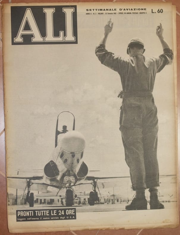 In folio. Dim. 40x30,5 cm. Pp. da 30 a 40+(4). Numero del 25 gennaio 1952 della rivista settimanale "Ali" di aviazione. "Ali" il periodico degli aviatori italiani nasce a Milano il 28 Marzo 1944 per essere pubblicato fino al 28 Aprile 1945 quando si interruppe a causa della guerra. Riappare nel 1951 fino al 1977 variando più volte di nome. Tra gli articoli presenti: Tecnica di riflesso, C.c.2 Caproni Campini Primato italiano, Aviazione cino coreana, Villaggio Milano, I delta di Lippisch a reazione, MAntova, LA morte è discesa a Hiroshima ecc...<BR>Numerose notizie di attualità e foto d'epoca all'interno.<BR>In buone condizioni. Copertina editoriale in buone condizioni generali con lievi usure ai margini e dorso. Legatura assente. All'interno le pagine si presentano in ottime condizioni con rare fioriture. Number of the 25th of january 1952 of the weekly magazine "Ali" of aviation.<BR>"Ali" the magazine of italian aviators was born in Milan the 28th of March 1944 to be published until the 28th of April 1945 when it was blocked due to the war. It reappeared in 1951 until 1977 changing names different times. Between the articles inside: Technique of reflexion, C.c.2 Caproni Campini Primato italiano, Aviation Chine Chorea, Village Milan, I delta di Lippisch, Mantova, death in Hiroshima ecc...<BR>Different information of actuality and photoes inside.<BR>In good conditions. Editorial cover in good general conditions slightly worn in the edges and spine. (see the photo). Binding is almost missing. Inside pages are in good conditions with occasional foxings.
