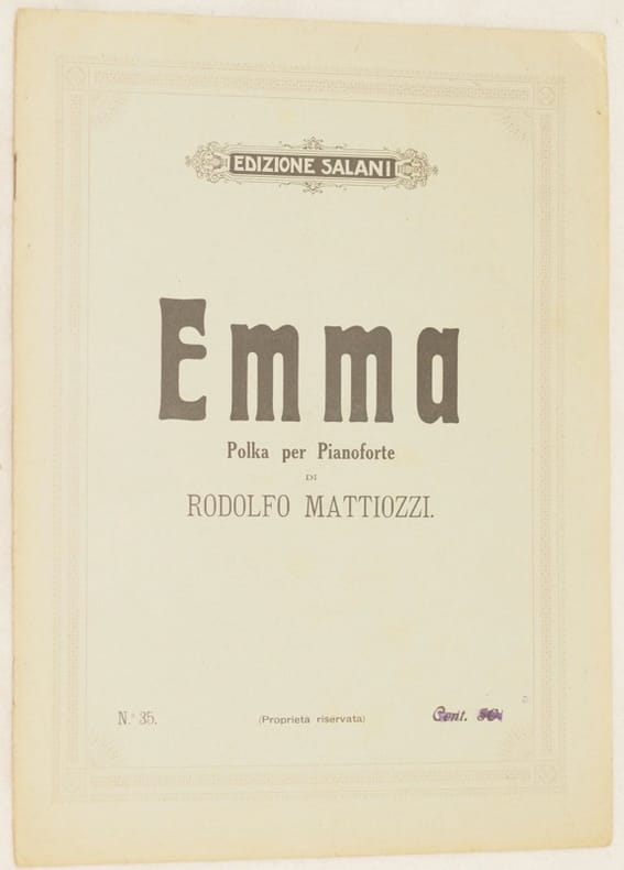 Edizione del 1920 della melodia "Emma" polka per pianoforte del compositore Rodolfo Mattiozzi (1831-1892). Bella copertina editoriale illustrata. In buone condizioni con rare fioriture. In 4. Formato cm. 32x23,5. Pp. (3). Edition of 1920 of the melody "Emma" for piano by the composer Rodolfo Mattiozzi (1831-1892). In good conditions with occasional foxings. Size In 4. cm 32x23,5. Pp. (3).