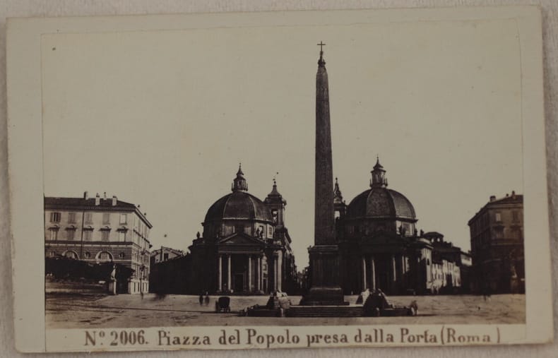 Foto originale all'albumina del 1870 circa che mostra la veduta animata di Piazza del popolo presa dalla porta. Al verso "Sommer & Behles" fotografi attivi con questo marchio tra il 1867 e il 1874. La fotografia è applicata su cartoncino originale marchiato. Dimensioni cartoncino: mm 63x101. Dimensioni foto: mm 59x90. In ottime condizioni. Original albumine photo of 1870 circa showing the view of Piazza del popolo from porta in Rome. In the verso "Sommer & Behles" photographer active with this trademark between 1867 and 1874. The photo has been applied in an original marked carton paper. Size of page: mm 63x101. Size of the photo: mm 59x90. In very good conditions.
