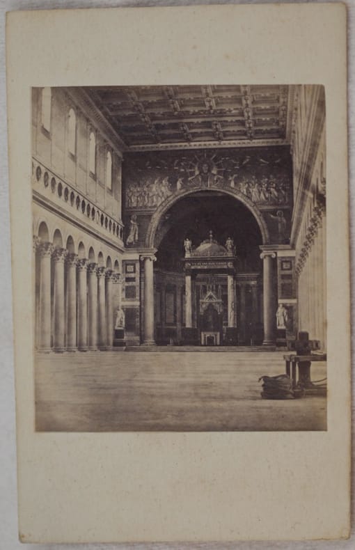 Foto originale all'albumina del 1870 circa che mostra l'interno della Basilica di San Paolo fuori le mura a Roma. Al verso "Sommer & Behles" fotografi attivi con questo marchio tra il 1867 e il 1874. La fotografia è applicata su cartoncino originale marchiato Dimensioni cartoncino: mm 100x63. Dimensioni foto: mm 64x55. In ottime condizioni. Original albumine photo of 1870 circa showing the internal of Basilica di San Paolo fuori le mura a in Rome. In the verso "Sommer & Behles" photographer active with this trademark between 1867 and 1874. The photo has been applied in an original marked carton paper. Size of page: mm 100x63. Size of the photo: mm 64x55 In very good conditions.