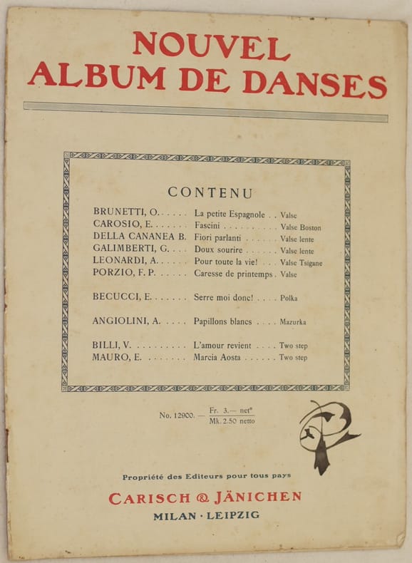 Bella raccolta di tre melodie per pianoforte. Senza data ma degli anni '20. All'interno: "La petite espagnole" di Brunetti, "Fascini" di Carosio, "Fiori parlanti" di Della Cananea. In ottime condizioni. Formato cm. 30,5x23,5. Pp. 16 Beautiful collection of three songs for piano. Not dated but of 1920's. Inside: "La petite espagnole" di Brunetti, "Fascini" di Carosio, "Fiori parlanti" di Della Cananea. In very good conditions. Size cm. cm. 30,5x23,5. Pp. 16