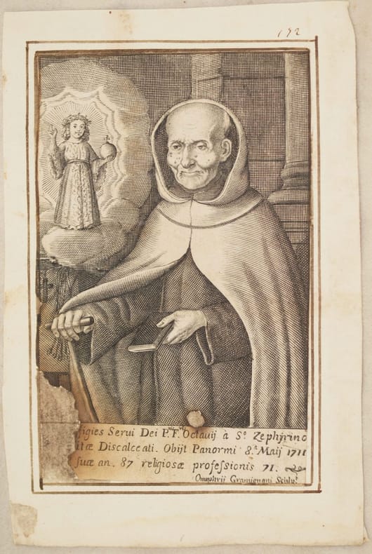 Bellissima incisione a bulino del 1750 circa che rappresenta Padre Ottavio carmelitano morto a Palermo, disegnata e incisa da Onofrio Gramignano. L'incisione è stata incollata su un foglio durante il XIX secolo. Segni di bruciatura all'angolo inferiore sinistro e al centro inficiante la parte incisa. Cornice manoscritta. Dimensioni foglio: mm 192x128. Dimensione incisione al margine: mm 155x98. In buone condizioni. Wonderful burin print of 1750 circa representing Father Ottavio dead in Palermo, drawn and engraved by Onofrio Gramignano. The print has been attached to a leaf during XIX century. Handwritten frame. Size of the page: mm 192x128. Size in the print: mm 155x98. In good conditions.