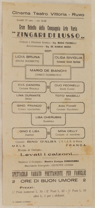 Bella locandina pubblicitaria del 1930 circa del Cinema teatro Vittoria di Ruvo di Puglia (Bari).<BR>Il volantino pubblicizza il debutto della Compagnia di arte varia "Zingari di lusso" diretta da Mario Pedinelli (Lidia Brun, Olga Siviglia, Mario de Bianchi, Eva Canora, Duo Pedinelli, Gino Franco, Aldo Fiorelli, Lisa Cherubini, Gino e Lisa, Toto Lina e Lidia). Direttore d'orchestra Giuseppe Donnarumma.<BR>In ottime condizioni. Piegature. Fioriture. 31x14. Beautiful advertising poster of 1930 circa of Cinema Teatro Vittoria in Ruvo di Puglia (Bari).<BR>The advertising poster advertises the debut of Compagnia di arte varia "Zingari di lusso" diretta da Mario Pedinelli (Lidia Brun, Olga Siviglia, Mario de Bianchi, Eva Canora, Duo Pedinelli, Gino Franco, Aldo Fiorelli, Lisa Cherubini, Gino e Lisa, Toto Lina e Lidia).<BR>Orchestra director Giuseppe Donnarumma. In very good conditions. Foxings. Foldings. Size cm. 31x14.