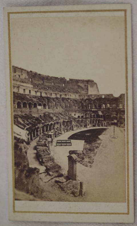 Foto originale all'albumina del 1860 circa che mostra l'interno del Colosseo a Roma. Al verso "Fratelli D'Alessandri via del Babuino Roma" celebre studio fotografico attivo in questa sede fino al 1865. La fotografia è applicata su cartoncino originale marchiato. Dimensioni cartoncino: mm 104x61. Dimensioni foto: mm 93x54. In ottime condizioni. Original albumine photo of 1860 circa showing the internal of Colosseo in Rome. In the verso "Fratelli D'Alessandri via del Babuino Roma" famous photographer active in Rome in this street until 1865. The photo has been applied in an original marked carton paper. Size of page: mm 104x61. Size of the photo: mm 93x54. In very good conditions.