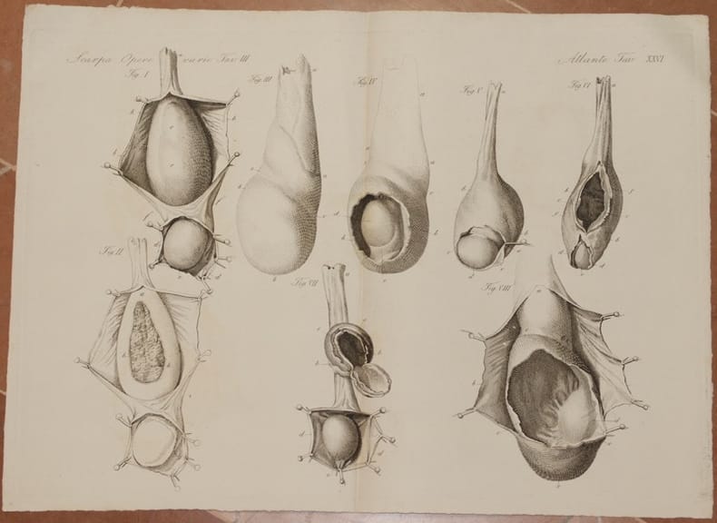 Stupenda tavola originale del 1839 di squisita fattura e grandi dimensioni proveniente dall'Atlante delle opere complete di Antonio Scarpa Firenze, V. Batelli e compagni. L'incisione mostra con estrema precisione l'anatomia dei testicoli. TECNICA: Litografia DIMENSIONI FOGLIO: 53x39 cm DIMENSIONI INCISIONE: 51x35,5 cm CONDIZIONI: ottime con margini in barbe. Very beautiful original engraving of 1839 of excellent manufacture and big dimension coming from: Atlante delle opere complete di Antonio Scarpa Firenze, V. Batelli e compagni. The print represents in a detailed way the anatomy of testicles. TECNIQUE: Litograph PAPER DIMENSION: 53x39 cm (21.26x15.55 inches) ENGRAVING DIMENSION: 51x35,5 cm (18.11x13.38 inches) CONDITION: very good, not regular original borders.