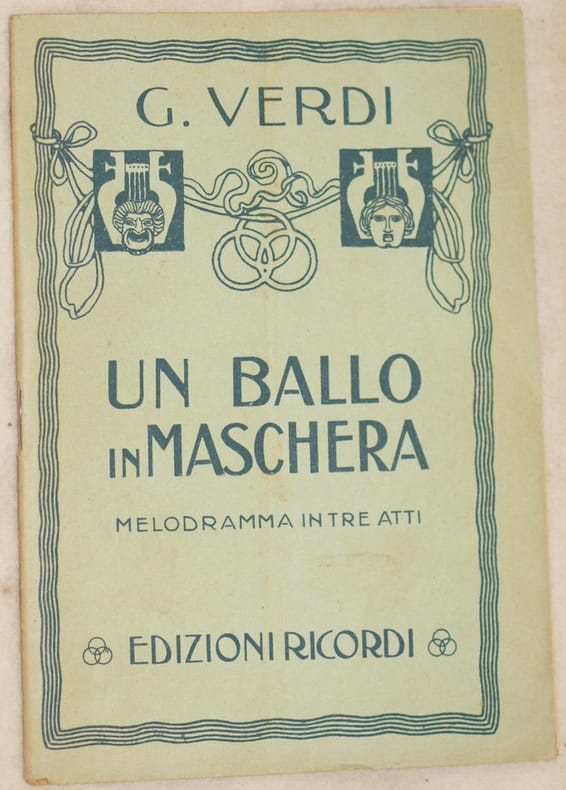 In 16. Dim. 18x12,5 cm. Pp. 32. Edizione senza data ma del 1916 del libretto d'opera Un ballo in maschera di Giuseppe Verdi (1813-1901). Timbro a secco assente. L'opera venne rappresentata per la prima volta il 17 febbraio 1859 al Teatro Apollo di Roma. Insieme al libretto il programma originale del Teatro Bellini con lista degli attori (Adalgisa Osti de Lutio, Nunzio Bari, Antonio Armentani, Campolattaro, Ciacon, Mollica, Silvestri, Ferraguti, Belfiore, maestro Ernesto Sebastiani). Nota manoscritta 5 febbraio 1916. In buone condizioni. Copertina editoriale in buone condizioni generali con lievi usure ai margini e dorso. (vedere foto). Legatura in buone condizioni. All'interno le pagine si presentano in ottime condizioni. Edition not dated but of 1916 of this booklet Un ballo in maschera by the italian composer Giuseppe Verdi (1813-1901).<BR>Embossed stamp is missing. The work was represented for the first time the 17th of february 1859 in Teatro Apollo of Rome. Togetehr with the booklet the programme of Teatro Bellini with list of actors (Adalgisa Osti de Lutio, Nunzio Bari, Antonio Armentani, Campolattaro, Ciacon, Mollica, Silvestri, Ferraguti, Belfiore, maestro Ernesto Sebastiani). Handwritten note 5th of february 1916. In good conditions.Editorial cover in good general conditions slightly worn in the edges and spine. Binding in good conditions. Inside pages are in good conditions with occasional foxings.