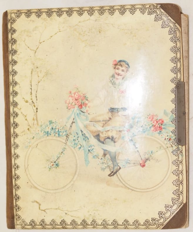 In 8. cm 27x21. Pp. (12). Bellissimo album portafoto del 1880 circa. La copertina dell'album è in tela con piatti in cellulosa. Il piatto anteriore mostra l'illustrazione di un uomo in bicicletta ornata di fiori. Cornice floreale. All'interno l'album contiene 8 portafoto con cornice dorata di formato grande (cm 13x9 spazio utile), 64 portafoto con cornice dorata di formato piccolo (cm 8x5 formato utile, 4 in ogni pagina). Qualche portafoto risulta danneggiato con parti staccate o strappate. In buone condizioni. Fibbia di chiusura mancante. Legatura in discrete condizioni con qualche rottura. Very beautiful photo album of 1880 circa. The cover of the album is in cloth with plates in cellulose. The front plate show the illustration of a man in bycicle decorated with flowers. Flower frame. The album contains 8 big spaces for photoes with golden frame (cm 13x9), 64 little spaces for photoes with golden frame (cm 8x5, 4 in each page). Some space is deatcehd with missing parts or tears. In good conditions. CLosure pin is missing. Binding in fair conditions with some crack.