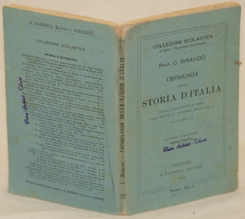 In 8. Dim. 19x13 cm. Pp. 112. Interessante opera del 1912 la cronologia della storia d'Italia dalla fondazione di Roma alla morte di Vittorio Emanuele II di Costanzo Rinaudo.<BR>Firma al frontespizio. Note manoscxritte a matita colorata. In buone condizioni. Brossura editoriale in discrete condizioni generali con lievi usure ai margini e dorso (vedere foto). Legatura quasi assente. All'interno le pagine si presentano in buone condizioni con rare fioriture. Interesting work of 1912 the chronology of history of Italy from establishment of Rome until the death of Vittorio Emanuele by Costanzo Rinaudo.<BR>Signature in the title page. In good conditions. Editorial cover in fair general conditions slightly worn in the edges and spine (see the photo). Binding is almost missing. Inside pages are in good conditions with occasional foxings.