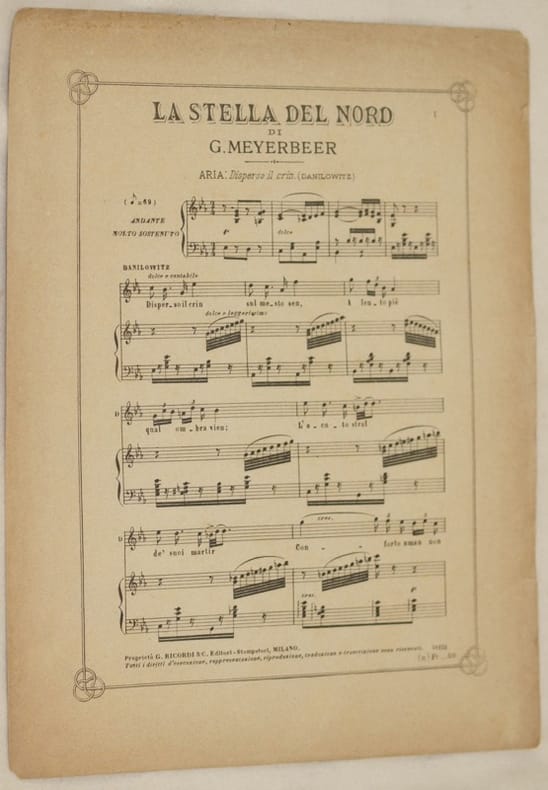Spartito della fine del XIX secolo dell'aria "Disperso il crin." tratta da La stella del Nord di Giacomo Meyerbeer. Timbro a secco alla prima pagina illeggibile. In discrete condizioni con fioriture e strappi marginali. Legatura in buone condizioni. Formato cm. 34,5x26. Pp. 4. Musical score of the end of XIX century of the piece "Disperso il crin." taken from La stella del nord by Giacomo Meyerbeer. Embossed stamp in the first page is unreadable. In fair condittions with foxings and tears in the edges. Binding in good conditions. Size cm. 34,5x26. Pp. 4.