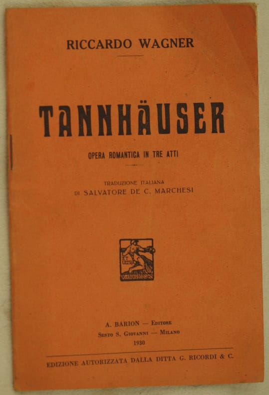 In 16. cm 18,5x12. Pp. 32 Bel libretto d'opera del 1930 dell'opera "Tannhauser" di Richard Wagner (1813-1883) compositore, librettista, direttore d'orchestra tedesco. L'opera venne rappresentata per la prima volta il 19 ottobre 1845 al teatro di Dresden. In buone condizioni. Bella brossura editoriale illustrata. Brossura editoriale in buone condizioni generali con lievi usure ai margini e dorso. Legatura in buone condizioni. All'interno le pagine si presentano in ottime condizioni con rare fioriture. Beautiful booklet of 1930 of the work "Tannhauser" by Richard Wagner (1813-1883) composer, booklet writer, director of orchestra. The first representation took place in Dresda the 19th of october 1845. In good conditions Editorial cover in good general conditions slightly worn in the edges. Binding in good conditions. Inside pages are in very good conditions with occasional foxings.