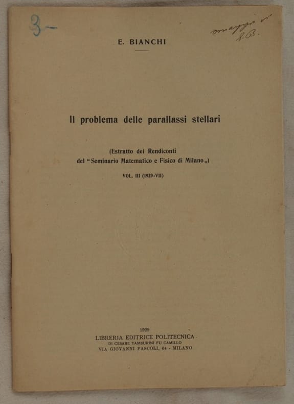 In 8. cm 24x17. Pp. 27. Interessante pubblicazione del 1929, uno studio sulle parallassi stellari scritto da E. Bianchi. Estratto dai Rendiconti del "Seminario matematico e fisico di Milano vol. III 1929 VII". In buone condizioni. Copertina editoriale in ottime condizioni generali con lievi usure ai margini e dorso. Legatura in buone condizioni. All'interno le pagine si presentano in ottime condizioni con rare fioriture. Interesting pamphlet of 1929, a study about stars by E. Bianchi. Estract from resuming of "Seminario matematico e fisico di Milano vol. III 1929 VII". In good conditions. Editorial cover in good general conditions slightly worn in the edges and spine. Binding in good conditions. Inside pages are in very good conditions with occasional foxings.