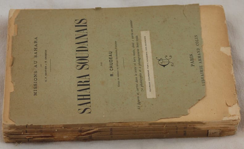 A. Colin, 1908 1909 2 volumes grands in-8, demi-maroquin brun, dos à nerfs, couvertures cons., plats toilés beige rel. Gavallet, X- 371 pp. 52 pl. hors-texte 96 phototypies, figures et cartes dans le texte, 4 cartesin fine 3 repl., 2 en coul. ; IV- 326 pp. 38 planches hors-texte de 74 illustrations photographiques sous serpentes, 80 figures in texte, 3 cartes et coupes dépliantes dont 1 carte en couleurs. Bel exemplaire. Voyages d’études de deux professeurs de l’Académie d’Alger. Emile Gautier pousse jusqu’à Tabelbalet et les premières dunes des erg Iguidi et Ech-Chech. Avec Chudau, en 1905, la mission gagne l’Adrar Ahnet puis In Zita . Gautier poursuit jusqu’à Gao et Chudeau prend le chemin du Hoggar.
