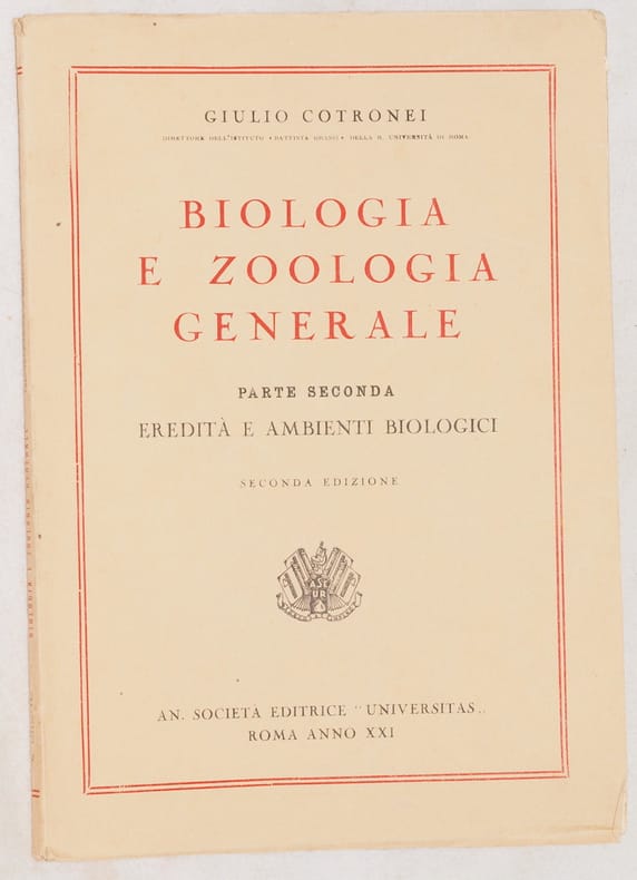 In 8. cm 25x17,5. Pp. da 407 a 553. Edizione del 1943 di questa pubblicazione di biologia e zoologia generale scritto da Giulio Cotronei professore di anatomia comparata nell'Università di Roma. Siamo in possesso della parte seconda solamente sull'eredità e ambienti biologici (capitolo XXI-XXIX). All'interno: variabilità, mendelismo, fattori letali consanguineita e mutazioni, eredita delle proprieta acquisite, determinazione del sesso, La vita e gli ambienti, parassitismo e parassiti ecc... Numerose illustrazioni e foto all'interno. In buone condizioni. Copertina editoriale in buone condizioni generali con lievi usure ai margini. Legatura in buone condizioni. Pagine in buone condizioni con rare fioriture. Edition of 1943 of this pamphlet of general biology and zoology written by Giulio Cotronei teacher of compared anatomy in the University of Rome. We only have the seocnd part about heredity and biological environment (chapters XXI-XXIX). Different illustrations and photoes inside. In good conditions Editorial cover in good general conditions slightly worn in the edges and spine. Binding in good conditions. Pages in good conditions with occasional foxings.