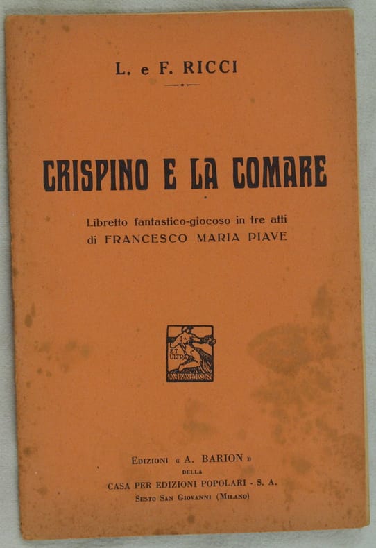 In 16. Dim. 18x12 cm. Pp. 32. Bel libretto d'opera del 1933 dell'opera "Crispino e la comare" di Luigi e Federico Ricci. In buone condizioni. Brossura editoriale in buone condizioni generali con lievi usure ai margini e dorso. Legatura in buone condizioni. All'interno le pagine si presentano in buone condizioni con rare fioriture. Beautiful booklet of 1933 of the work "Crispino e la comare" by Luigi e Federico Ricci.<BR>In good conditions. Editorial cover in good general conditions slightly worn in the edges and spine. (see the photo). Binding in good conditions. Inside pages are in good conditions with occasional foxings.