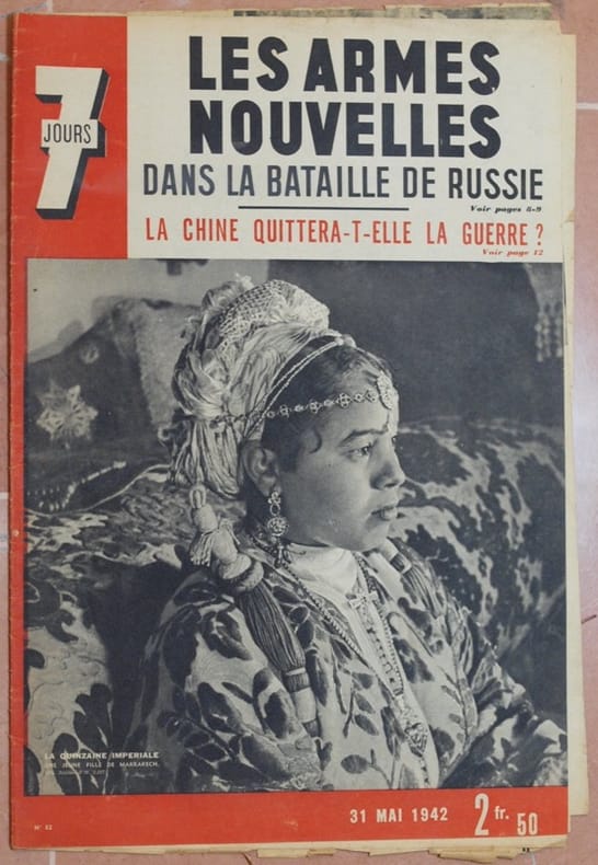 Numero del 31 maggio 1942 della rivista settimanale "7jours" di attualità.<BR>Tra gli articoli presenti: Schmeling e Joe Louis, prime foto su PEarl Harbour, I turchi guardano il Ponte di Galata, Battaglia del Mare di Corallo,. Battaglia di Kertch, a Lille i Fratellini, Catherine Cayret, Long Yun, Nelson Knudsen Hillman, Glaoui pacha di Marrakech ecc..<BR>Numerose notizie di attualità e foto d'epoca all'interno.<BR>In buone condizioni. Copertina editoriale in buone condizioni generali con lievi usure ai margini e dorso. Legatura in discrete condizioni. All'interno le pagine si presentano in ottime condizioni con rare fioriture. In folio. Dim. 41,5x28 cm. Pp. 16. Number of the 31st of may 1942 of the weekly magazine "7jours"<BR>Between the articles inside: Schmeling and Joe Louis, first photoes about PEarl Harbour, the turkish look at Bridge of Galata, Battle of Coral sea, Battle of Kertch, in Lille the Fratellini, Catherine Cayret, Long Yun, Nelson Knudsen Hillman, Glaoui pacha di Marrakech ecc...<BR>Different information of actuality and photoes inside.<BR>In good conditions. Editorial cover in good general conditions slightly worn in the edges and spine. (see the photo). Binding in fair conditions. Inside pages are in very good conditions with occasional foxings.
