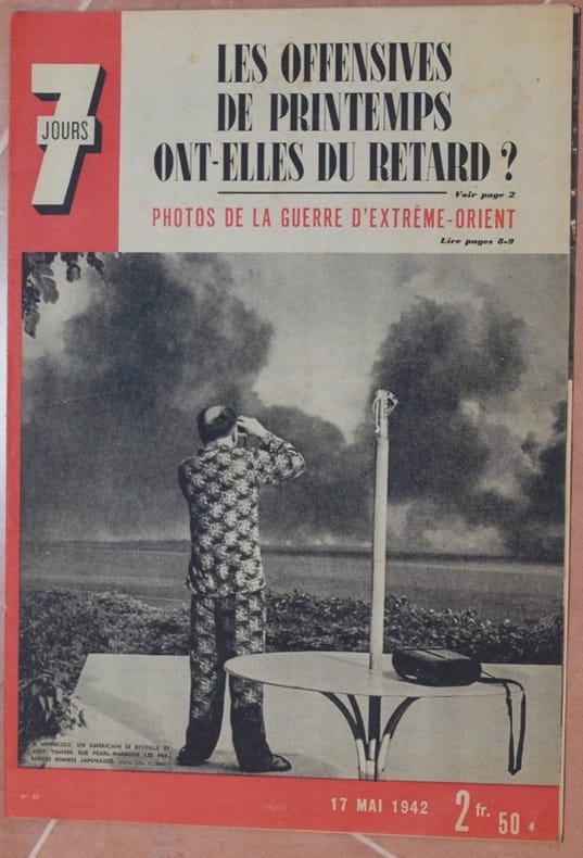 In folio. Dim. 41,5x28,5 cm. Pp. 16. Numero del 17 maggio 1943 della rivista settimanale "7jours" di attualità. Tra gli articoli presenti: la presa di Singapore, A New York non ci sono francesi che parlano francese, in ISlanda ci sono 40000 americani, Sir Cosmo, Segreto di Salzbourg, Tchang Kai Chek, l'Hotel di Beaujolais, Jean Marais, D. Mansfeld, M. Swing ecc..<BR>Numerose notizie di attualità e foto d'epoca all'interno.<BR>In buone condizioni. Copertina editoriale in buone condizioni generali con lievi usure ai margini e dorso. Legatura in discrete condizioni. All'interno le pagine si presentano in ottime condizioni con rare fioriture. Number of the 17th of may 1942 of the weekly magazine "7jours" Between the articles inside: prise of Singapore, In New York there are no french people who talk french people, in Iceland there are 40000 americans, Sir Cosmo, Segret ofSalzbourg, Tchang Kai Chek, The Hotel of Beaujolais, Jean Marais, D. Mansfeld, M. Swing etc... Different information of actuality and photoes inside. In good conditions. Editorial cover in good general conditions slightly worn in the edges and spine. Binding in fair conditions. Inside pages are in very good conditions with occasional foxings.