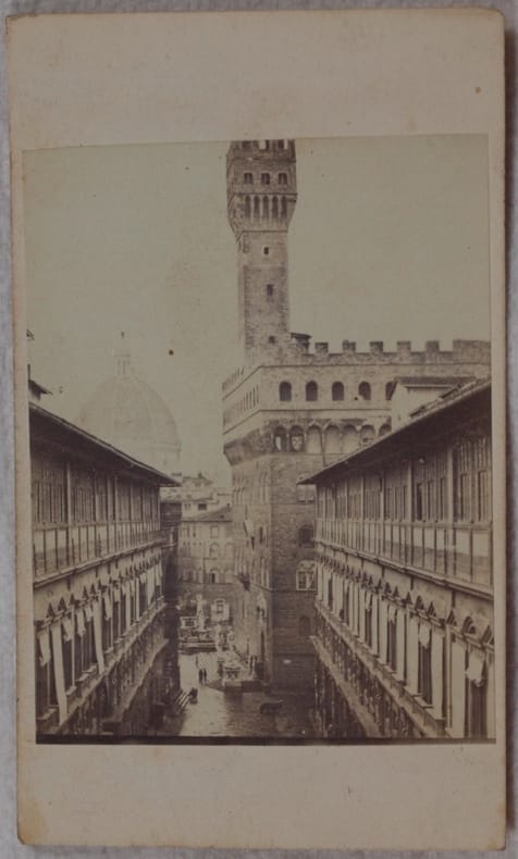 Foto originale all'albumina animata del 1870 circa che mostra la Galleria degli Uffizi a Firenze La fotografia è applicata su cartoncino. Dimensioni cartoncino: mm 105x62. Dimensioni foto: mm 75x60. In ottime condizioni. Original albumine photo of 1860 circa showing Galleria degli Uffizi in Florence. The photo has been applied in a carton paper. Size of page: mm 105x62. Size of the photo: mm 75x60. In very good conditions.