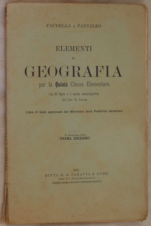 In 8. Dim. 21,5x14,5 cm. Pp. 78. Edizione del 1905 di questo manaule di geografia per la quinta classe elementare scritto da Faudella e Pantaleo. All'interno numerose illustrazioni e alcune piccole mappe: Isola d'Elba, Golfo di Napoli, Ischia, laguna veneta, Alpi, Il Po ecc.. Alla fine elementi di cosmografia. Le tre mappe in cromolitografia risultano assenti. In buone condizioni. Copertina editoriale in buone condizioni generali con lievi usure ai margini e dorso (vedere foto). Legatura in buone condizioni con qualche lieve rottura. All'interno le pagine si presentano in buone condizioni con rare fioriture. Mende. Edition of 1905 of this manual for 5th year of primary school written by Faudella e Pantaleo. Insdie different illustrations nad some little maps: Elba Island, Gulf of Naples, Ischia, laguna veneta, Alpi, Il Po ecc.. Some elements of cosmography inside. The three maps in chromolythography are missing In good conditions. Editorial cover in good general conditions slightly worn in the edges and spine (see the photo). Binding in good conditions with some slight crack. Inside pages are in good conditions with occasional foxings.