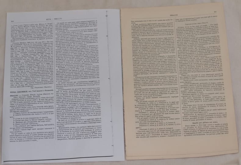 In 4. Dim. 29,5x19 cm. Pp. da 300 a 308.Interessante estratto del 1890 circa tratto dall'Enciclopedia delle arti e industrie edita da Utet sullo smalto scritto dall'Ing. V. Beltrandi. La parte relativa allo smalto inizia da pag. 300 e consta di 9 pagine. All'interno numerose ricette con dosi precise per la preparazione di vari colori utilizzati per la pittura sul vetro, porcellana, orefici conterie e mosaici, vasellame di ferro e ghisa, smalti trasparenti e chiari, fabbricazione degli occhi artificiali ecc... Prima pagina di testo mancante, viene fornita una fotocopia. In ottime condizioni. Copertina assente. Legatura quasi assente. All'interno le pagine si presentano in ottime condizioni con rare fioriture. Pagina 300 mancante. Interesting extract of 1890 from Enciclopedia delle arti e industrie edited by Utet about enamel by Beltrandi The part relating silk begins from pag. 300 and is made up of 9 pages. Inside different recipes with exact measure to prepare enamel for paiting on glass, porcelain, jewellery and mosaics, iron pots, transparent and light enamels, fabbrication of artificial eyes etc... First page of text is missing, we provide a photocopy. In very good conditions. Cover is missing. Binding is almost missing. Inside pages are in very good conditions with occasional foxings. Page 300 is missing.
