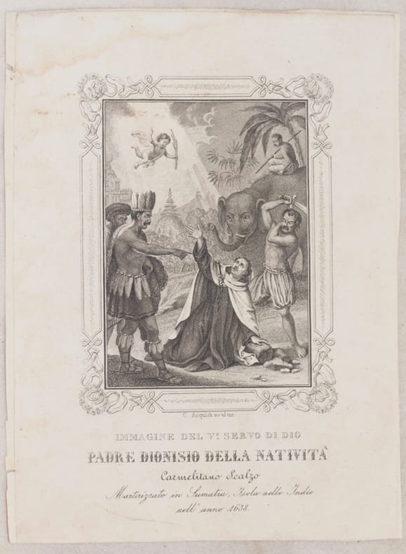 Bella incisione su acciaio originale del 1840, Padre Dioniso della Natività incisa da Camillo Acquisti incisore romano attivo durante la prima metà del XIX secolo. Padre Dionisio viene ritratto durante il martirio a Sumatra, Indonesia. L'incisione è stata incollata su un foglio durante il XIX secolo. Dimensioni foglio: mm 180x135. Dimensione incisione al margine: mm 150x90 In ottime condizioni. Nice steel print of 1840 circa 1840, Father Dioniso della Natività engraved by Camillo Acquisti roman engraver active during the first half of XIX century. The engraving shows Father Dionisio during his martyre in Sumatra, Indonesia. The print has been attached to a leaf during XIX century. Size of the page: mm 180x135 Size in the print: mm 150x90. In very good conditions.