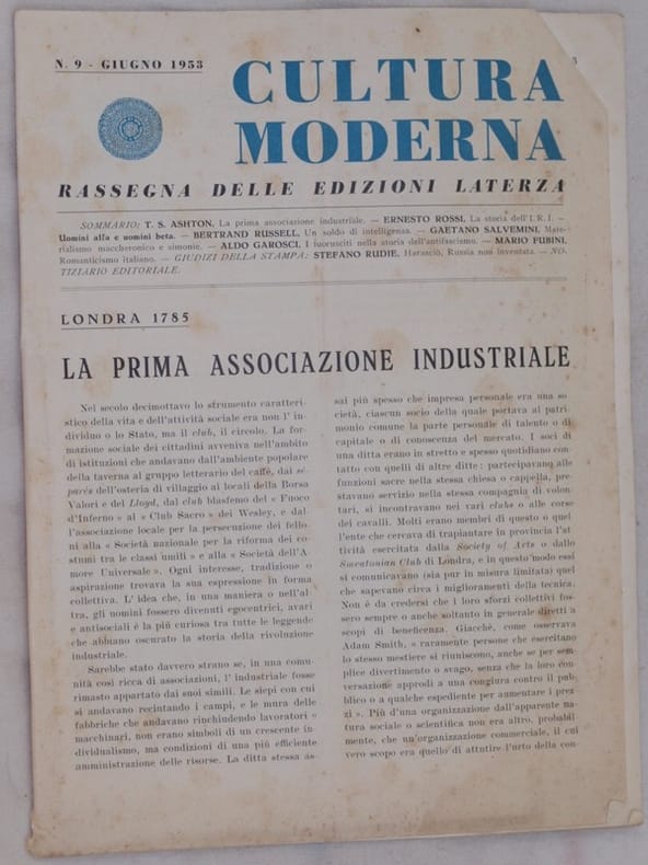 In 4. Dim. 28x20,5 cm. Pp. 20 Numero del giugno 1953 della rivista Cultura moderna, rassegna delle edizioni Laterza All'interno: Londra 1785 la prima associazione industriale, La storia dell'IRI, Uomini Alfa e Uomini Beta, Un soldo di intelligenza di Bertrand Russell, Materialismo maccheronico e simonie, I fuoriusciti nella storia dell'antifascismo, romanticismo italiano ecc... In buone condizioni. Copertina editoriale in buone condizioni generali con lievi usure ai margini e dorso. Legatura in discrete condizioni. Pagine in buone condizioni con rare fioriture. Number of the 9h of june 1959 of the magazine Bilancio. Inside: New cpontinent of Emilio Cecchi, Oriigns of modern Germany by Geoffrey Barraclough, Gioacchino Volpe, how we will live (an american villa using solr energy for heating, The 1959 in Yuscany byRaffaele Ciampini, Velazquez by Carl Justi, The terasures of New Atlantide, Paleochristian art by Volbach e Hirmer ecc... In good conditions. Editorial cover in good general conditions slightly worn in the edges and spine. Binding in fair conditions. Pages in good conditions with occasional foxings.