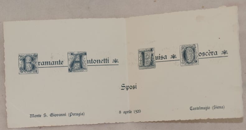 Bella partecipazione di nozze tra Bramante Antonetti di Monte San Giovanni (Perugia) e Luisa Doscera di Castelmuzio (Siena) da celebrarsi l'8 Aprile 1920. In ottime condizioni. Formato cm 11x25. Beautiful wedding card of Bramante Antonetti from Monte San Giovanni (Perugia) and Luisa Doscera di Castelmuzio (Siena) the 8th of April 1920. In very good conditions. Size cm 11x25