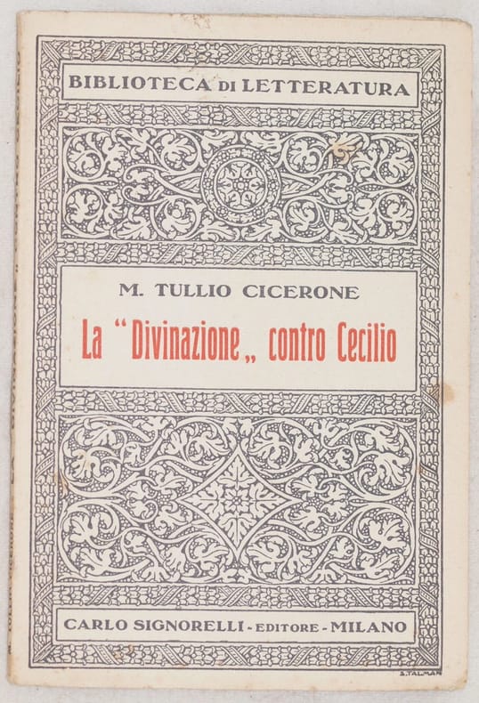 In 16. Dim. 15,5x10,5 cm. Pp. 52 Edizione Signorelli della collana "Biblioteca di letteratura" dell'opera classica "La Divinazione contro Cecilio" di Marco Tullio Cicerone. Traduzione di Raffaele Fimiani. L'opera è completa. Graziose brossure con decorazioni. In buone condizioni. Copertina editoriale in buone condizioni con lievi usure ai margini e dorso. Legatura in buone condizioni. All'interno le pagine si presentano in buone condizioni con fioriture. Signorelli edition of the series "Biblioteca di letteratura" of the classic work "La divinazione contro Cecilio" by Marco Tullio Cicerone. Translation by Raffaele Fimiani. Nice decorations on the covers. In good conditions. Editorial cover in good conditions slightly worn in the edges and spine. Binding in good conditions. Inside pages are in good conditions with foxings.