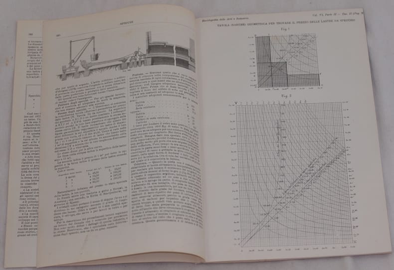In 4. Dim. 29x19 cm. Pp. da 387 a 397. Interessante estratto del 1890 tratto dall'Enciclopedia delle arti e industrie edita da Utet sulla produzione degli specchi scritto da Carlo Anfosso. La parte relativa agli specchi inizia da pag. 387 e consta di 11 pagine. All'interno qualche illustrazione e una planche tavola geometrica per trovare il prezzo delle lastre da specchio L'autore descrive la produzione e i costi di vari tipi di specchio, i costi negli anni dal 1702 al 1889, le tecniche. In ottime condizion Copertina assente. Legatura in buone condizioni. All'interno le pagine si presentano in ottime condizioni con rare fioriture. Interesting extract of 1890 from Enciclopedia delle arti e industrie edited by Utet about mirrors written by Carlo Anfosso. The part relating mirrors begins from pag. 387 and is made up of 11 pages. Inside different illustrations and a planche with a method showing how to calculate price of mirrors. The author describes the production and costs of different kind of mirrors, the costs in years from 1702 until 1889, the techniques. In very good conditions. Cover is missing. Binding in good conditions. Inside pages are in very good conditions with occasional foxings. Page 14 is missing.