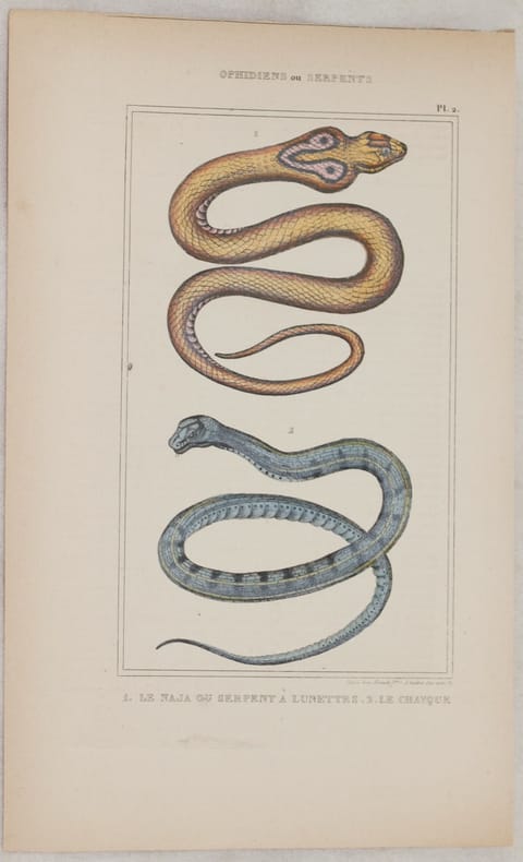 Bella incisione colorata a mano del 1825 circa tratta dalla monumentale opera di storia naturale di Buffon, carta spessa. L'incisione rappresenta due specie di serpenti dei quali il cobra dagli occhiali o cobra indiano. In buone condizioni, fioriture. TECNICA: Incisione su acciaio colorata AUTORE: Lacepede DIMENSIONI FOGLIO: cm 22x14 DIMENSIONI INCISIONE: cm 15,5x9 EPOCA: 1825 circa Buffon fu un'esponente del movimento scientifico legato all'illuminismo e le sue teorie influenzarono le generazioni successive di naturalisti in particolare Jean Baptiste Lamarck e Charles Darwin.<BR>Questa è la sua opera più celebre ed è l'"Histoire Naturelle" pubblicata per la prima volta tra il 1749 ed il 1789 in 36 volumi di cui 8 postumi grazie al lavoro di Bernard Lacepede. Buffon espone tutto il sapere dell'epoca nel campo delle scienze naturali e proprio in questo scritto rilevò le somiglianze tra l'uomo e la scimmia e la possibilità di una genealogia comune. Nice engraving of 1825 circa taken from the monumental work of natural history by Buffon, wide paper.<BR>The engraving represents two species of snakes: one of them the Indian Cobra.<BR>In good conditions, foxings. TECHNIQUE: coloured steel engraving AUTHOR: Lacepede LEAF SIZE: cm 22x13,5 PRINT'S SIZE: cm 15,5x9 PERIOD: 1825 circa Buffon was an exponent of the scientific movement connected to illuminism and his theories inspired the next generations of naturalists in particular Jean Baptiste Lamarck and Charles Darwin.<BR>His most famous work is l'"Histoire Naturelle" published for the first time between 1749 and 1789 in 36 volumes of which 8 are posthumous thanks to the work of Bernard Lacepede. Buffon exposes in the work all the notions in natural history and in this writing in particular underlined the similarity between monkeys and man with a possibility of common genealogy.