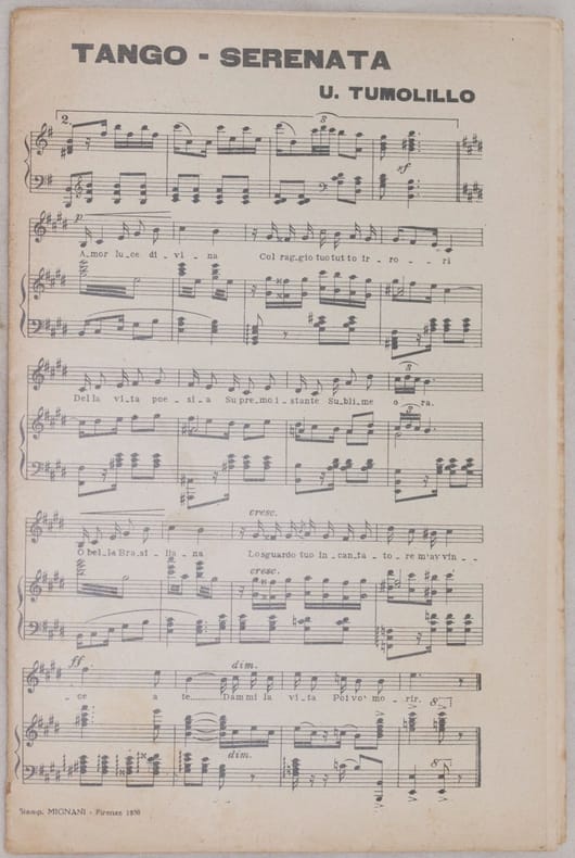 Bello spartito, partitura completa per orchestra del 1930 di una canzone. Copertina mancante. Ex libris in qualche pagina GENERE: Tango serenata STRUMENTI: 1) pianoforte violini violoncello clarinetto flauto tromba sassofono trombone contrabasso batteria 2) pianoforte violini violoncello clarinetto flauto tromba sassofono trombone contrabasso batteria ANNO: 1930 NOTE: In 8. cm 27x17,5. pp. 24. Ottime condizioni Beautiful score of one song a complete score for orchestra of 1930. Cover is missing. Ex libris in tsome pages MUSIC: Tango serenata INSTRUMENTS: 1) piano violins violoncello clarinet flute trumpet saxophone trombone contrabbass drums 2) piano violins violoncello clarinet flute trumpet saxophone trombone contrabbass drums YEAR: 1930 NOTES: In 8. cm 27x17,5. pp. 24. In very good conditions.