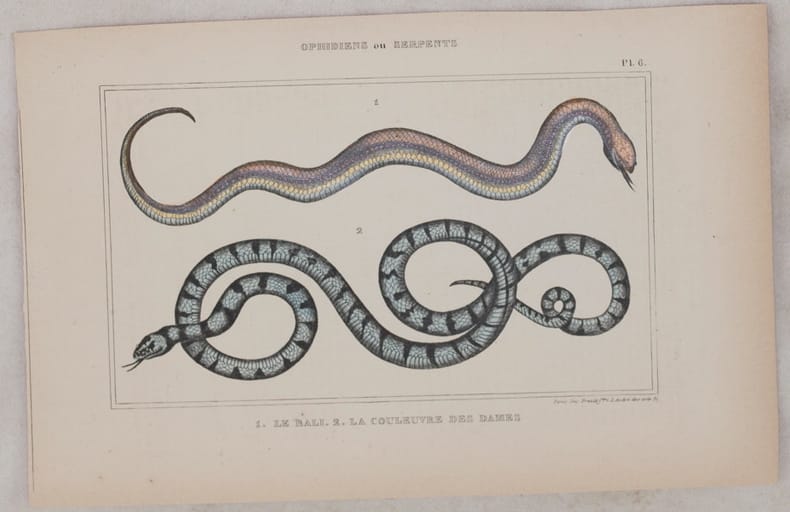 Bella incisione colorata a mano del 1825 circa tratta dalla monumentale opera di storia naturale di Buffon, carta spessa. L'incisione rappresenta due specie di serpenti: la Natrix natrix o biscia dal collare e una specie di Bali In buone condizioni, fioriture. TECNICA: Incisione su acciaio colorata AUTORE: Lacepede DIMENSIONI FOGLIO: cm 21,5x13,5 DIMENSIONI INCISIONE: cm 15,5x9,5 EPOCA: 1825 circa Buffon fu un'esponente del movimento scientifico legato all'illuminismo e le sue teorie influenzarono le generazioni successive di naturalisti in particolare Jean Baptiste Lamarck e Charles Darwin.<BR>Questa è la sua opera più celebre ed è l'"Histoire Naturelle" pubblicata per la prima volta tra il 1749 ed il 1789 in 36 volumi di cui 8 postumi grazie al lavoro di Bernard Lacepede. Buffon espone tutto il sapere dell'epoca nel campo delle scienze naturali e proprio in questo scritto rilevò le somiglianze tra l'uomo e la scimmia e la possibilità di una genealogia comune. Nice engraving of 1825 circa taken from the monumental work of natural history by Buffon, wide paper.<BR>The engraving represents tto species of snakes: Natrix natrix or grass snake and a species from Bali<BR>In good conditions, foxings.TECHNIQUE: coloured steel engraving AUTHOR: Lacepede LEAF SIZE: cm 21,5x13,5 PRINT'S SIZE: cm 15,5x9,5 PERIOD: 1825 circa Buffon was an exponent of the scientific movement connected to illuminism and his theories inspired the next generations of naturalists in particular Jean Baptiste Lamarck and Charles Darwin.<BR>His most famous work is l'"Histoire Naturelle" published for the first time between 1749 and 1789 in 36 volumes of which 8 are posthumous thanks to the work of Bernard Lacepede. Buffon exposes in the work all the notions in natural history and in this writing in particular underlined the similarity between monkeys and man with a possibility of common genealogy.