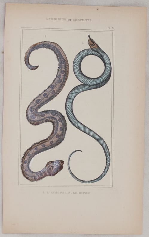55 planches rehaussées en couleurs format 22x 14 cm [ A la Société Bibliophile, vers 1849 ] Ophidiens ou Serpents [ Lot de 20 planches coloriées au pinceau ] La Vipère commune ; L'Aspic ; La Vipère d'Egypte - Le Naja ou Serpent à Lunettes ; Le Chayque - L'Hoemachate ; La Brasilienne - La vipère fer-de-lance ; La tête triangulaire - L'Atropos ; Le Dipse - Le Molure ; La double Raie - La couleuvre commune ; La quatre Raies - L'Argus ; Le Sibon - etc. etc.
