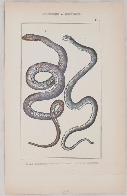 Bella incisione colorata a mano del 1825 circa tratta dalla monumentale opera di storia naturale di Buffon, carta spessa. L'incisione rappresenta due specie di serpenti: il colubro di Esculapio e una specie di biscia In buone condizioni, fioriture. TECNICA: Incisione su acciaio colorata AUTORE: Lacepede DIMENSIONI FOGLIO: cm 22x13,5 DIMENSIONI INCISIONE: cm 15,5x9,5 EPOCA: 1825 circa Buffon fu un'esponente del movimento scientifico legato all'illuminismo e le sue teorie influenzarono le generazioni successive di naturalisti in particolare Jean Baptiste Lamarck e Charles Darwin.<BR>Questa è la sua opera più celebre ed è l'"Histoire Naturelle" pubblicata per la prima volta tra il 1749 ed il 1789 in 36 volumi di cui 8 postumi grazie al lavoro di Bernard Lacepede. Buffon espone tutto il sapere dell'epoca nel campo delle scienze naturali e proprio in questo scritto rilevò le somiglianze tra l'uomo e la scimmia e la possibilità di una genealogia comune. Nice engraving of 1825 circa taken from the monumental work of natural history by Buffon, wide paper. The engraving represents two species of snakes: the esculapian snake and a species of snake. In good conditions, foxings. TECHNIQUE: coloured steel engraving AUTHOR: Lacepede LEAF SIZE: cm 22x13,5 PRINT'S SIZE: cm 15,5x9,5 PERIOD: 1825 circa Buffon was an exponent of the scientific movement connected to illuminism and his theories inspired the next generations of naturalists in particular Jean Baptiste Lamarck and Charles Darwin.<BR>His most famous work is l'"Histoire Naturelle" published for the first time between 1749 and 1789 in 36 volumes of which 8 are posthumous thanks to the work of Bernard Lacepede. Buffon exposes in the work all the notions in natural history and in this writing in particular underlined the similarity between monkeys and man with a possibility of common genealogy.