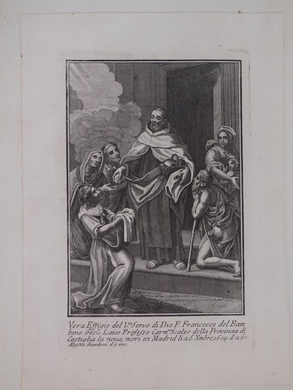 Incisione originale della seconda metà del XVIII secolo il ritratto di Francesco del Bambino Gesù dell'incisore Alessio Giardoni. L'incisione è stata incollata su un un foglio durante il XIX secolo Dimensioni foglio: mm 265x190. Dimensioni incisione: mm 195x135. In buone condizioni. Original print of the second half of XVIII century the portrait of Francesco del Bambino Gesù by the engraver Alessio Giardoni. The print has been attached in a page during XIX century. Size of the page: mm 265x190. Size in the print: 195x135. In good conditions.