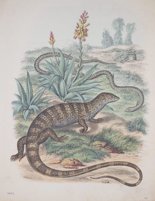 Bella incisione colorata a mano del 1863 che rappresenta una scena naturale con un'iguana del deserto e una luscengola. Planche estratta da libro. TECNICA: Incisione su acciaio colorata DIMENSIONI FOGLIO: cm 26x19,5 DIMENSIONI INCISIONE: cm 22x16,5 EPOCA: 1863 In buone condizioni, qualche fioritura. Nice coloured engraving of 1863 representing a natural scene with a desert iguana and an italian three toed skink. Planche removed from a book In good conditions, foxings. TECHNIQUE: coloured steel engraving LEAF SIZE: cm 26x19,5 PRINT'S SIZE: cm 22x16,5 PERIOD: 1863