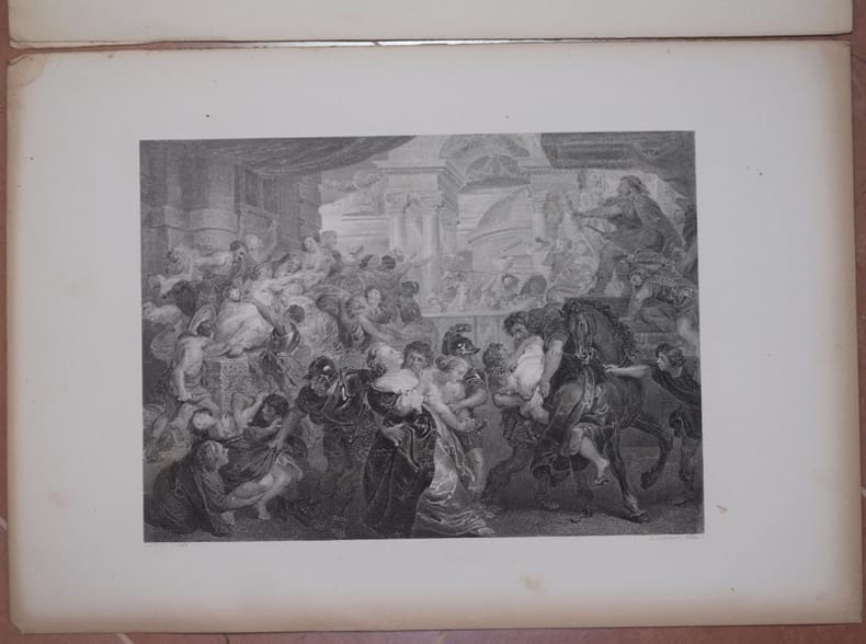 Incisione su acciaio del 1840 del celebre Ratto delle Sabine inciso da J. Stewart sul celebre dipinto di Peter Paul Rubens (1577-1640). Insieme all'incisione la pagina con il titolo dell'incisione e il testo esplicativo. Dimensioni foglio: cm 29x42,5. Dimensione incisione al margine: mm 20,5x28. In buone condizioni. Qualche piccola gora d'umidità marginale e angolo inferiore sinistro mancante. Steel engraving of 1840 of the famous Rape of the Sabines engraved by J. Stewart on the famous painting by Peter Paul Rubens (1577-1640). Togetehr with the print the page with the title of the print and the descriptive text. Size of the page: cm 29x42,5 Size in the print: cm 20,5x28. In good conditions. Some water wstains in the edges and lower left corner is missing.