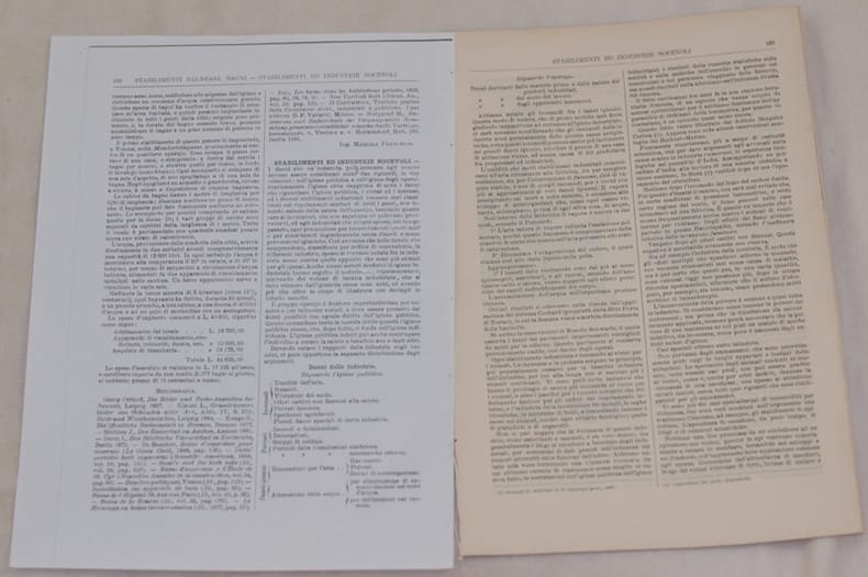 In 4. Dim. 29x19 cm. Pp. da 426 a 438. Interessante estratto del 1890 circa tratto dall'Enciclopedia delle arti e industrie edita da Utet sugli stabilimenti e industrie nocevoli scritto da Anfosso. La parte relativa alle industrie nocevoli inizia da pag. 426 e consta di 13 pagine. L'autore parla di igiene industriale, rumore, il fumo del carbon fossile, mattatoi, laboratori di vivisezione, pericolo di incendi a tal scopo viene descritto gli strumenti di controllo delle guardie tra cui l'orologio Collin, sostanze chimiche ecc... Prima pagina di testo mancante, viene fornita una fotocopia. In ottime condizioni. Copertina assente. Legatura quasi assente. All'interno le pagine si presentano in ottime condizioni con rare fioriture. Pagina 300 mancante. Interesting extract of 1890 from Enciclopedia delle arti e industrie edited by Utet about dangerous industries written by Beltrandi. The part relating dangerous industries begins from pag. 426 and is made up of 13 pages. The author talks about industrial hygiene, rumor, the smoke of foxyle carbon, labs of vivisection, fires, for this reason the control tools Collin given to guards, chemical substances ecc... First page of text is missing, we provide a photocopy. In very good conditions. Cover is missing (see the photo). Binding is almost missing. Inside pages are in very good conditions with occasional foxings. Page 300 is missing.
