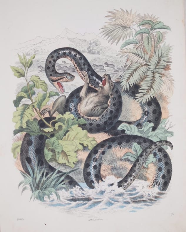 Bella incisione colorata a mano del 1865 che rappresenta una scena naturale con un'anaconda e un topo. Planche estratta da libro. TECNICA: Incisione su acciaio colorata<BR>DIMENSIONI FOGLIO: cm 27x19,5 DIMENSIONI INCISIONE: cm 21,5x17 EPOCA: 1865 In buone condizioni, qualche fioritura Nice coloured engraving of 1865 representing a natural scene with an anaconda and a mouse. Planche removed from a book In good conditions, foxings. TECHNIQUE: coloured steel engraving LEAF SIZE: cm 27x19,5 PRINT'S SIZE: cm 21,5x17 PERIOD: 1865