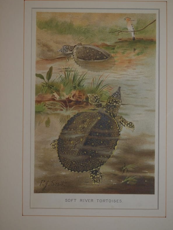 Bella incisione colorata del 1890 circa che rappresenta una scena naturale con un gruppo di tartarughe dal guscio molle. L'incisione è montata su elegante passepartout. Planche estratta da libro. TECNICA: Incisione su acciaio colorata AUTORE: P. G. Smit DIMENSIONI PASSEPARTOUT: cm 35x27 DIMENSIONI INCISIONE: cm 20x15 EPOCA: 1890 circa In buone condizioni, qualche fioritura. Nice coloured engraving of 1890 circa representing a natural scene with a group of soft river tortoises. The print is mounted in an elegant passepartout. Planche removed from a book In good conditions, foxings. TECHNIQUE: coloured steel engraving AUTHOR: P. G. Smit PASSEPARTOUT SIZE: cm 35x27 PRINT'S SIZE: cm 20x15 PERIOD: 1890 circa