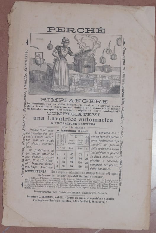 Bella reclame pubblicitaria dei primi del novecento della lavatrice automatica. Al verso Acqua Sangemini. In buone condizioni.Dim. cm 25,5x16,5. Scarce advertising pamphlet of the first years of XX centuryof washing machine In the verso Sangemini water. In good conditions. Dim. cm 25,5x16,5