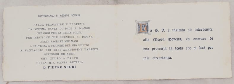 Bella partecipazione di nozze di Pietro Negri da celebrarsi il 3 agosto 1914 a Casteldilago (Arrone, Terni). In ottime condizioni. Formato cm 9,5x14.Beautiful wedding card of Pietro Negri from Casteldilago (Arrone, Terni) of 3rd of august 1914. In very good conditions. Size cm 9,5x14.