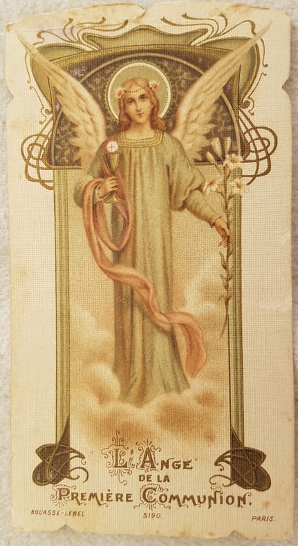 Immaginetta sacra dell'Angelo della Prima comunione del 1908, ricordo della prima comunione di Laura Persi fatta nella Cappella delle Dame di Nazareth a Roma.<BR>In buone condizioni. In 24. Dim. cm 11,5x6. Holy image of the Angel of First Communion of 1908, remembering of the first communion of LAura Persi made in the Chapel of Ladies of Nazareth in Rome.<BR>In good conditions.In 24. Dim. cm 11,5x6.