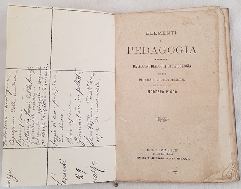 In 8. Dim. 19,5x13 cm. Pp. 114. Raro volume del 1872, alcuni elementi di pedagogia scritto da Modesto Picco ad uso dei maestri di grado superiore.All'interno elementi di psicologia, disposizioni morali del maestro elementare, memoria, scelta dei libri, igiene ecc... In discrete condizioni. Copertina morbida posticcia con note manoscritte in buone condizioni generali con lievi usure ai margini e dorso. Copertina decorata a protezione con titolo manoscritto Legatura in discrete condizioni con qualche rottura. All'interno le pagine si presentano in buone condizioni con fioriture.Piegature agli angoli.Scarce volume of 1872, some elements of pedagogy written by Modesto Picco for the usage of teachers of primary school.Inside elements of psychology, morality, memory, choice of books, hygiene ecc... In fair conditions. Soft false cover with handwritten notes in good general conditions slightly worn in the edges and spine. Decorated protection cover with handwritten title. Binding in fair conditions with some cracks. Inside pages are in good conditions with foxings.