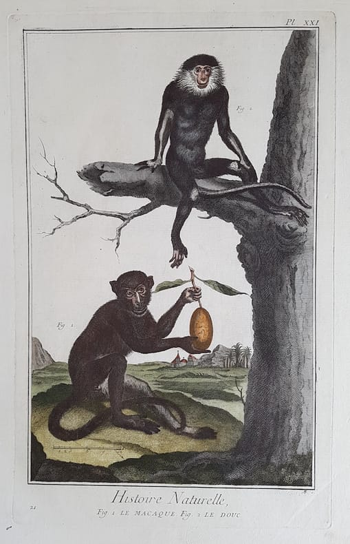 Deliziosa incisione colorata ad acquarello del 1770 circa che mostra un macaco e un langur duca. Grandi dimensioni. Autore: Antonio Baratti (1724-1787) Atlante: Diderot et dAlembert Encyclopedie Livorno, 1770-1778 Data: 1770 circa Tecnica: incisione a bulino acquarellata a mano Dimensione della pagina: 40,5x27 cm Dimensione dell'incisione: 35,5x22,5 cm Condizioni: ottime. Qualche fioritura Segno di tarlo al margine inferiore Nice print of 1770s featuring a macaque and a langur duca coloured with aquarello by hand. Big size. Author: Antonio Baratti (1724-1787) Atlas: Diderot et dAlembert Encyclopedie Livorno, 1770-1778 Date: 1770 circa Technique: burin engraving Leaf Dimension: 40,5x27 cm Engraving Dimension: 35,5x22,5 cm Conditions: Very good conditions.