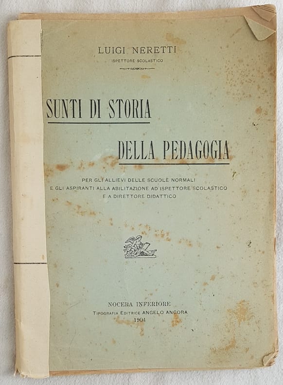 In 8. Dim. 20x15 cm. Pp. 152+(4).Edizione del 1904 di questa opera di storia della pedagogia scritto da Luigi Neretti ad uso delle scuole. All'interno: Oriente antico, Occidente antico, Medio Evo, Rinascimento, Tempi moderni, La pedagogia nel secolo XIX, Pedagogia femminile ecc Numerose biografie di pedagogisti. In discrete condizioni. Copertina editoriale in discrete condizioni con usure ai margini e dorso rivestito da carta. Legatura in mediocri condizioni con rotture. All'interno le pagine si presentano in ottime condizioni con rare fioriture.Edition of 1904 of this work of history of pedagogy written by Luigi Neretti for the usage of school. Inside: Ancient Middle East, Ancient western countries, Middleage, Rinascimento, Modern times, Pedagogy during XIX century, Pedagogy ecc... In fair conditions. Editorial cover in fair conditions with wearings in the edges and spine covered by paper. Binding in poor conditions with foxings. Inside pages are in very good conditions with occasional foxings.