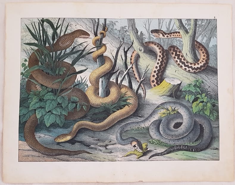 Deliziosa incisione del 1880 circa che mostra una scena naturale con sei specie di serpenti. Grandi dimensioni. Data: 1880 circa Tecnica: incisione a bulino Dimensione della pagina: 41,5x32,5 cm Dimensione dell'incisione: 26,5x36 c Condizioni: ottime. Qualche fioritura Coloured engraving refined by hand of 1880 circa representing a natural scene with six pecies of snakes. Big size. In good conditions, foxings. Vertical folding.<BR>TECHNIQUE: coloured steel engraving refined by hand LEAF SIZE: cm 32,5x41,5 PRINT'S SIZE: cm 26,5x36 PERIOD: 1880 circa CONDITION: very good conditions. Some foxings