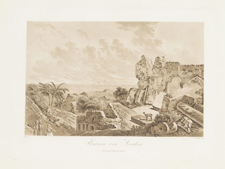 Bella veduta animata di alcune rovine nella città di Ashkelon, Israele, vicino alla Striscia di Gaza. Grandi dimensioni.<BR><BR>Autore: Georg Dobler (1788-1845)<BR><BR>Atlante: Comte de Forbin Reise nach dem Morgenlande Prag, bei P. Bohmanns Erben<BR><BR>Data: 1820 circa<BR><BR>Tecnica: Acquatinta<BR><BR>Dimensione della pagina: 41x42 cm <BR><BR>Dimensione dell'incisione: 26x34,5 cm <BR><BR> <BR><BR>Condizioni: Ottime. Piccolo strappo al margine inferiore Beatiful animated view of ruins in the city of Ashkelon, Israel, near Gaza Strip. Big size<BR><BR>Author: Georg Dobler (1788-1845)<BR><BR>Atlas: Comte de Forbin Reise nach dem Morgenlande Prag, bei P. Bohmanns Erben<BR><BR>Date: 1820 circa<BR><BR>Technique: acquatint in sepia<BR><BR>Leaf Dimension: 41x42 cm <BR><BR>Engraving Dimension: 26x34,5 cm <BR><BR>Conditions: Very good conditions.
